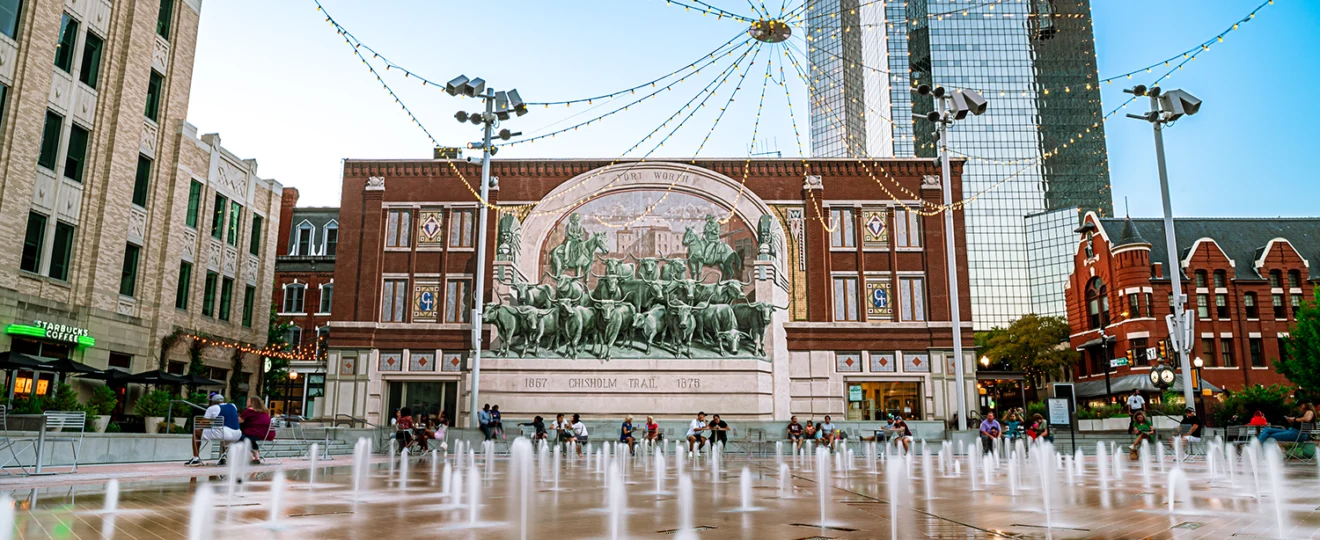 エリア内にある広場「サンダンス・スクエア・プラザ(Sundance Square Plaza)」は、全米屈指の屋外集会場として知られ、“フォートワースのリビングルーム“と呼ばれています。牛追いの時代を描いた巨大な壁画チザム・トレイルの壁画(Chisolm Trail Mural)や日中は子ども達の遊び場、夜には美しくライトアップされる噴水は人気の撮影スポットとなっています。日中にはパラソルが開きカフェを楽しむ人々の姿がみられ、夜にはライブイベントなどが開催されナイトライフを楽しむ大人のスペースへと変わります。