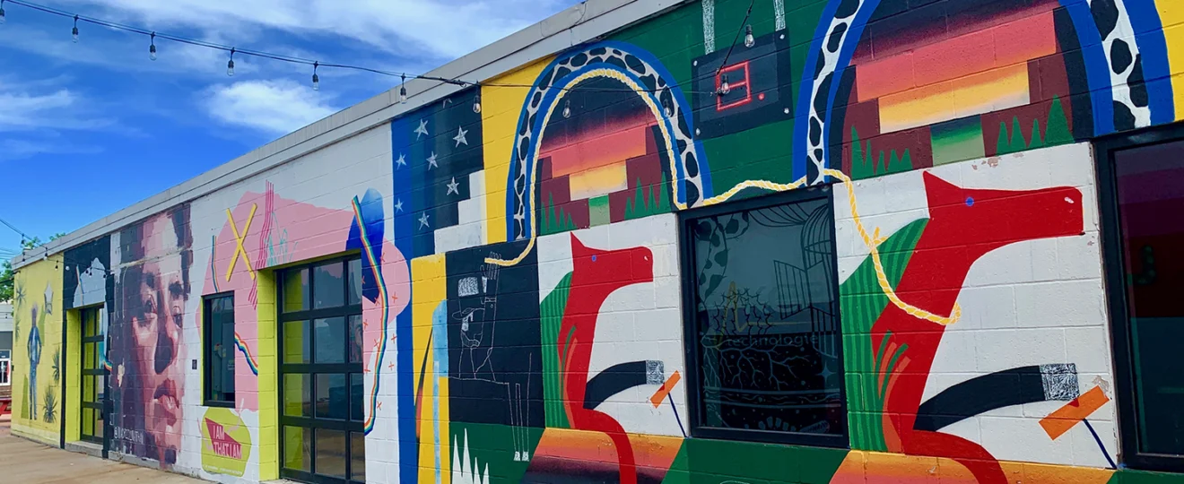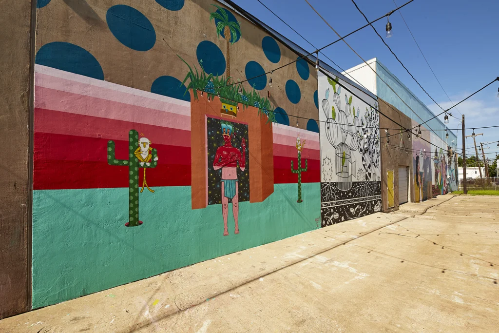 独立系カルチャーの空気が漂うこのエリアの象徴的存在が、常設の屋外アートスペースであるインスピレーション・アレー(Inspiration Alley)です。若手クリエイターを中心としたミューラル(壁画)作品が並び、フォートワースでも規模の大きな屋外アートスポットのひとつとして知られています。無機質な印象の建物と大胆な色彩の壁画がつくる風景は、写真撮影スポットとしても人気があります。